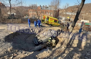 Машина, которой управляла девушка, рухнула в огромную яму во Владивостоке